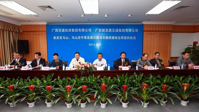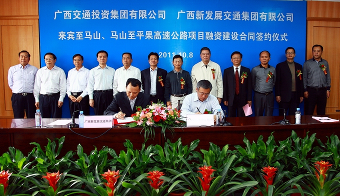 10月8日,集团公司和广西交通投资集团公司来宾至马山、马山至平果高速公路项目融资建设合同签约仪式在南宁举行。自治区交通运输厅厅长潘巍、总工程师王劼耘;集团公司董事长、党委书记朱坚和,总经理李定伦,党委副书记、纪委书记张友坐,副总经理刘明洪,总会计师邓远志,总工程师覃炳贤;交投集团副董事长、总经理、党委副书记刘可,党委副书记、纪委书记罗斯卡,副总经理韦昌鸿、廉向东,及双方有关部门、直属各单位负责人参加了签约仪式。