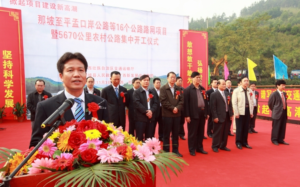为贯彻落实自治区党委、政府在全区掀起项目建设新高潮的决策部署,冲刺第四季度,完成全年公路建设目标任务,自治区交通运输厅于11月3日举行全区公路路网改造项目集中开工仪式。由集团公司承办的分会场——那坡至平孟口岸公路等16个公路路网项目暨5670公里农村公路集中开工仪式在百色市那坡县德隆乡隆重举行。自治区交通运输厅纪检组长、厅党组成员朱名胜,百色市市委常委、政法委书记周武红,市人大常委会党组成员黄五同,集团公司党委书记、董事长朱坚和、总经理李定伦、党委副书记张友坐、副总经理刘明洪、总工程师覃炳贤,自治区公路管理局、百色市公路管理局、交通运输局、那坡县四家班子、集团公司直属各单位领导及有关部门负责人等出席开工仪式。