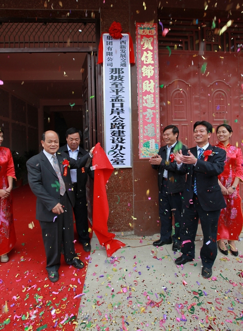 自治区交通运输厅纪检组长、厅党组成员朱名胜(左一)、集团公司董事长朱坚和(右二)等领导为项目建设办公室揭牌