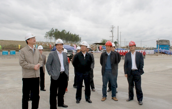图为:交通运输厅副厅长梁毅(右二)、崇左市委书记赵乐秦(右三)、崇左市副市长张鸿(左一)在项目现场检查调研