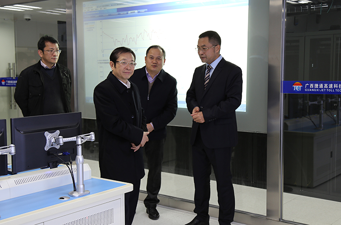 高雄深入了解了广西ETC项目攻坚及实现全国联网后运营情况,充分肯定了新发展集团在科技、人才领域的突出优势,特别是近期在参与智慧交通、智慧城市建设中所作出的努力和贡献。高雄一行参观了建设在捷通公司的全区ETC系统中心机房,认真听取了吕毅关于我区ETC系统运营状况、八桂行卡发行量、机房设备及安装运转、车载OBU装载使用等情况汇报。