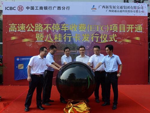 刘明洪在致辞中表示,早在今年3月份,工行就成为广西首批入围ETC项目的合作银行,双方成功签署了ETC项目合作协议,并取得了丰硕的合作成果,此次仪式正式启动,标志着双方合作迈上一个全新的高度。集团公司将不断推进ETC业务市场拓展,未来ETC将不只限于高速公路收费,还会不断向加油站、停车场、城市小区、普通公路等相关领域延伸。
