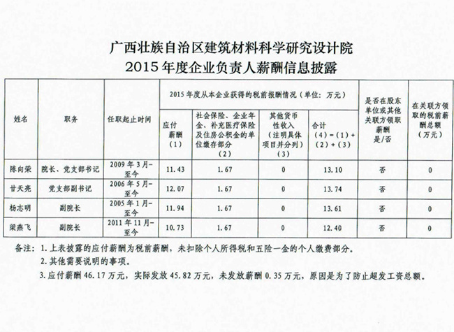 广西壮族自治区建筑材料科学研究设计院2015年度企业负责人薪酬信息披露