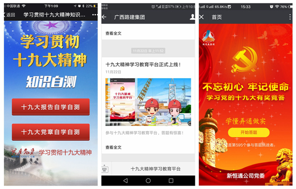 而广西路建集团、新恒通公司等直属企业微信公众号也开辟了十九大精神学习教育平台,开创性地把知识性较强的党建知识竞答与趣味性十足的抢红包结合到一起,寓教于乐,大大激发了广大党员干部和企业员工的学习积极性。