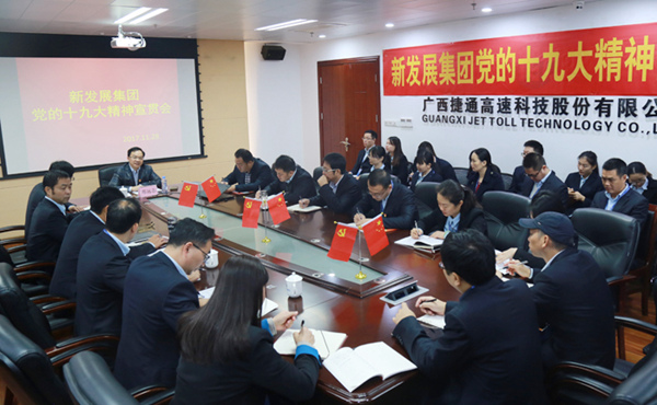 11月28日上午,集团公司总会计师邓远志来到捷通公司宣讲党的十九大精神,并开展工作调研。捷通公司党总支班子及总部人员和南宁市自营网点负责人近70人参加了学习。