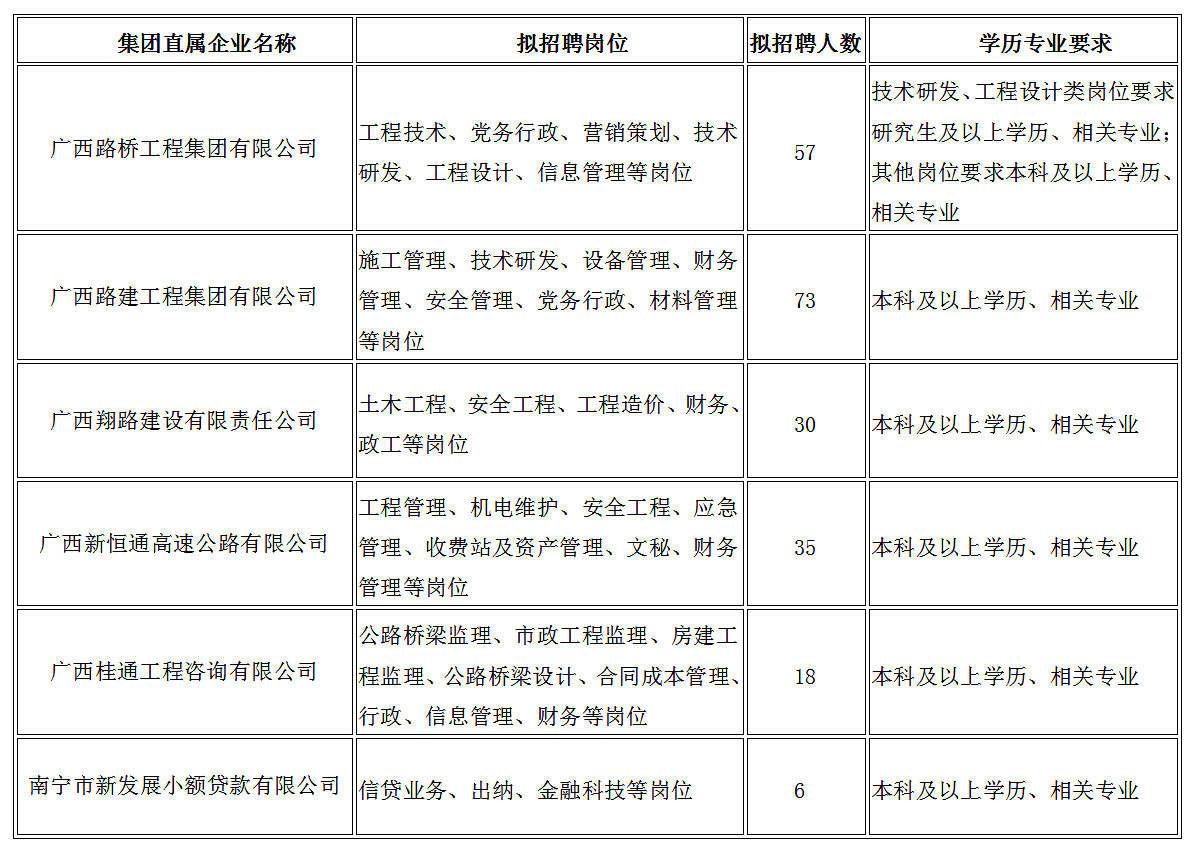 集团公司现有广西路桥工程集团、广西路建工程集团、广西交通设计集团、广西交通科学研究院有限公司、广西翔路建设有限责任公司、广西新恒通高速公路有限公司、广西桂通工程咨询有限公司、南宁市新发展小额贷款有限公司等16家直属企业。