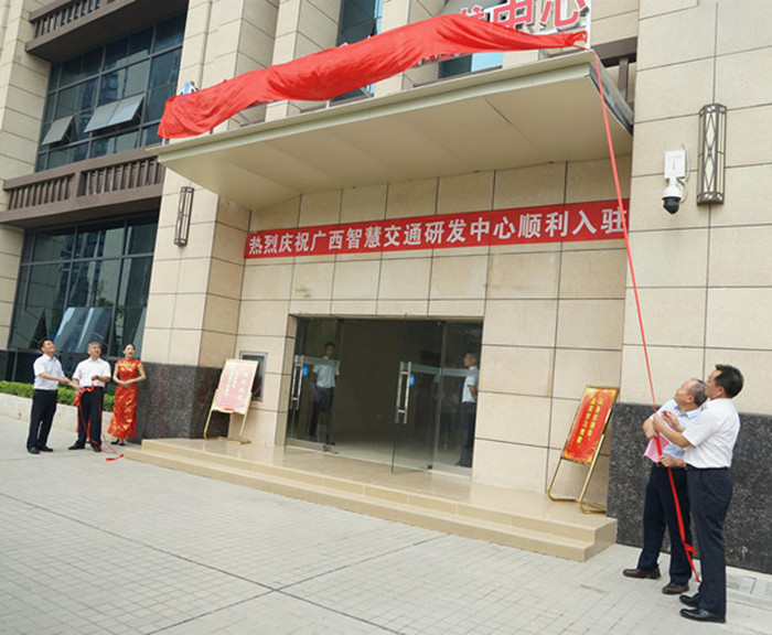 在喜庆热烈的气氛中,集团公司领导朱坚和、唐咸秋、翁科、韦庆和共同为广西智慧交通研发中心暨入驻单位揭牌。仪式结束后,领导合影留念,并参观了新办公楼。