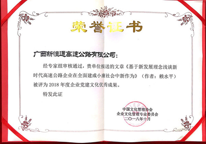 会上,由赖水平撰写的文章《基于新发展理念浅谈新时代高速公路企业在全面建成小康社会中新作为》在企业党建文化优秀成果评比中,被评为2018年度企业党建文化优秀成果;由新恒通公司都巴指挥部创作团队拍摄的《迁动人心》微电影荣获“最美企业之声”代言作品荣誉称号。