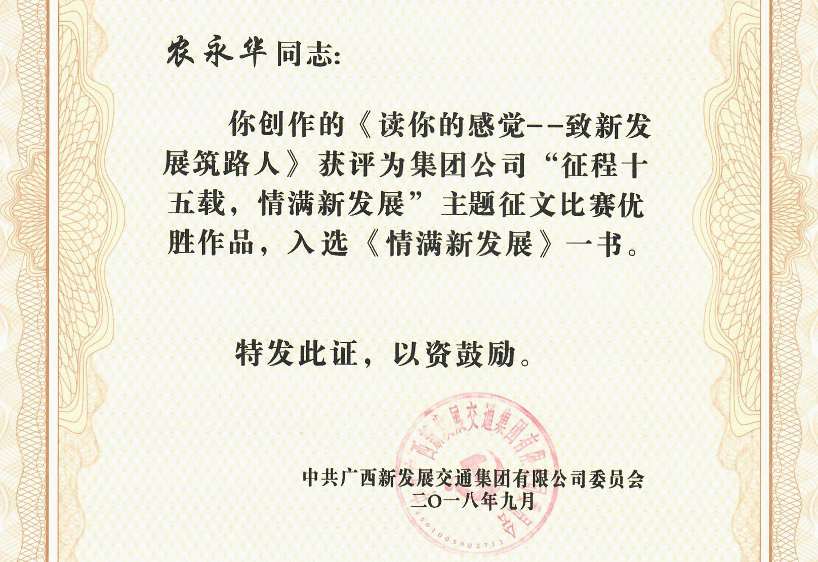 近日,广西新发展交通集团“征程十五载,情满新发展”主题征文比赛进入到了评比表彰阶段,共有104篇征文被评为优胜作品,入选《情满新发展》一书。