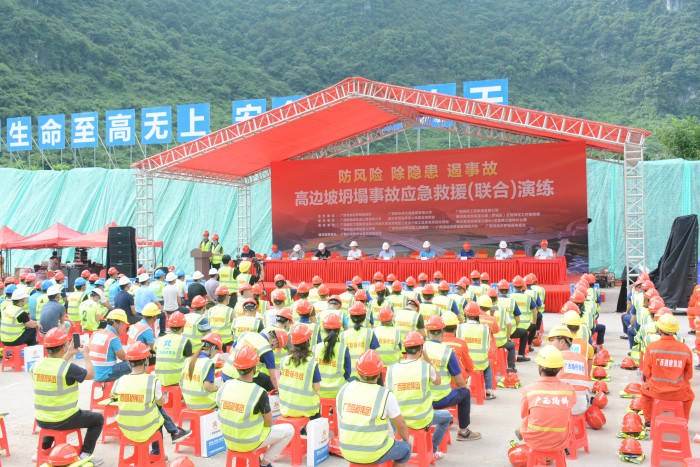 作为“防风险 除隐患 遏事故”主题“安全生产月”活动内容之一,该演练结合融水至河池高速公路项目施工中存在的高边坡坍塌重大危险源的特点,旨在加强参建人员安全防范意识,提高安全应急处置、救援能力。