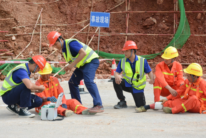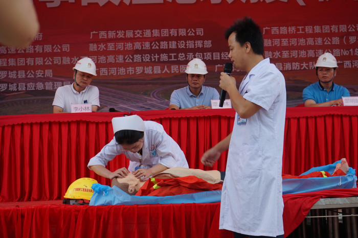当天的演练现场模拟情景为:2019年6月20日,在罗城县四把镇冲湾屯附近,融河高速公路K54+100高边坡处现场4名边坡防护作业人员正在紧张的施工,由于连续雨天上边坡坡顶土体部分突然滑落,继而出现大的滑坡裂缝,随之大面积土石体坍塌,1名施工人员被垮塌的土石压埋。事故发生后,参与演练人员及时报告和启动应急预案,在坍塌现场设置临时指挥部,指挥现场救援,将伤者抬出被困位置后,在演练会场进行现场医疗和急救演示,再由救护车送到罗城县人民医院进一步治疗。
