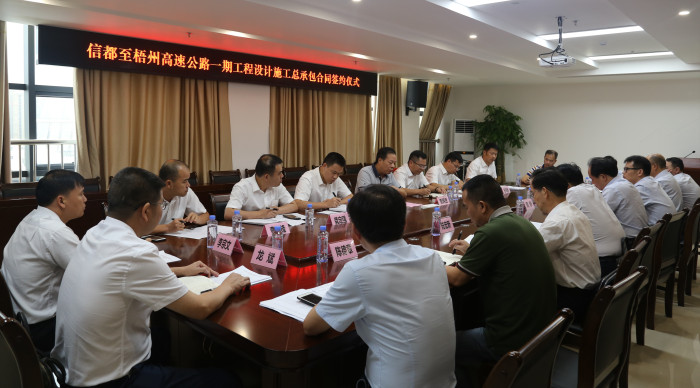 2019年7月22日下午,信都至梧州高速公路一期设计施工承包合同签约仪式在广西智慧交通研发中心1926会议室举行。北投集团总工程师覃炳贤,公司领导赖水平、蓝日彦、龚定强、苏伟胜及中标单位路建集团、交通设计集团的领导以及各单位相关部门代表参加仪式。